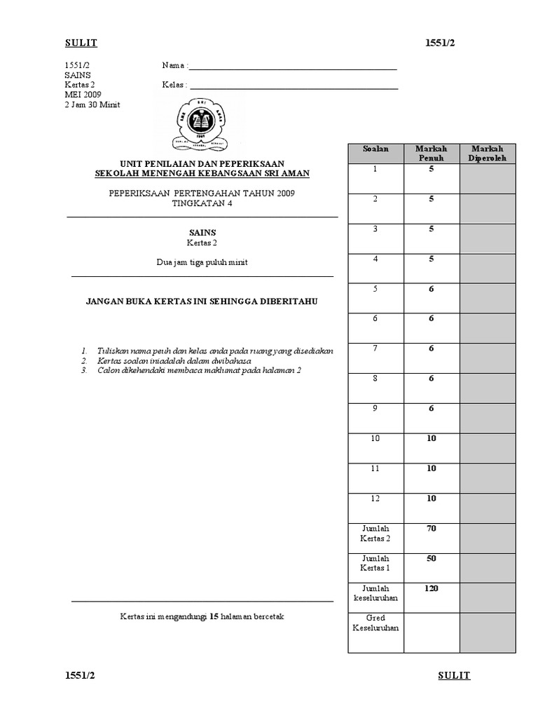 Kertas Soalan Sains Spm Kertas 2 An Tahun Tingkatan 4 Pdf